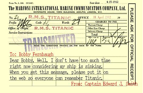 Titanic It's referred to by many different names like "The Ship of Dreams" and "The Unsinkable Ship", but there's more than just the names - there's a story. What really happened on the night of April 14, 1912? First of all, the Titanic was built by White Star Lines and costed about $10 million to build. It weighed over 46,000 tons and was 882.5 feet in length. A ship of this size had only 20 total life boats, when it was capable of holding at least 64 lifeboats, more than enough for the 2,300 passengers. The Captain was Edward J. Smith (a personal marconigram is below). When the Titanic struck that infamous iceberg in the Northern Atlantic Ocean at 11:40 P.M. on the evening of April 14, 1912 (5th day of the 6 day cruise), the gash was approximately 300 feet long. The Titanic sank at 2:30 A.M. on April 15, 1912. Of the 2,300 passengers on board, only about 700 survived. While the Titanic's story is very interesting, at the same time it's a very tragic one too. It was one unbelievable ship. Here are some of the many links to various Titanic sites. |